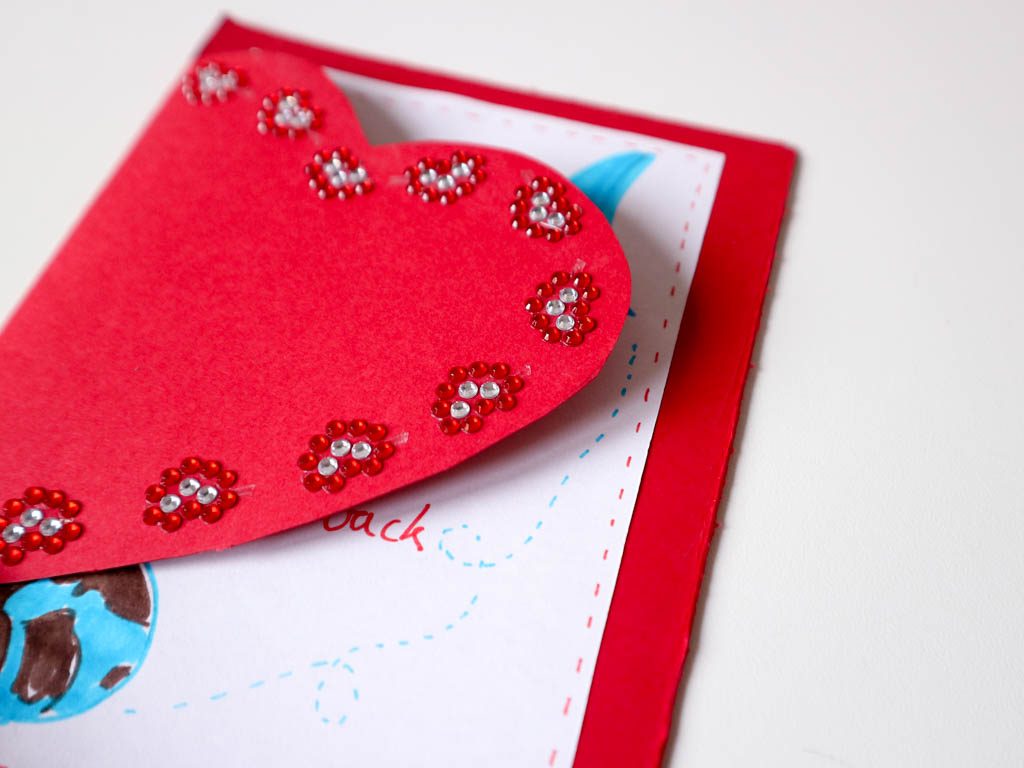 - Marca con un lápiz la parte del corazón que queda dentro de la tarjeta y recortalo, pero sólo recorta la cartulina que corresponde a la portada de la tarjeta.