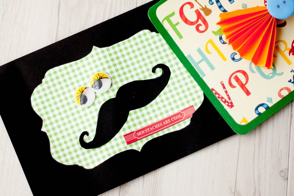 Para hacer esta tarjeta, dobla una cartulina negra por la mitad, y pega una galleta en algún color que destaque. Sobre ella coloca el bigote y dos ojos un poco ladeados(los encontrarás en cualquier bazar). Pégalos muy juntos para darles un aire más gracioso