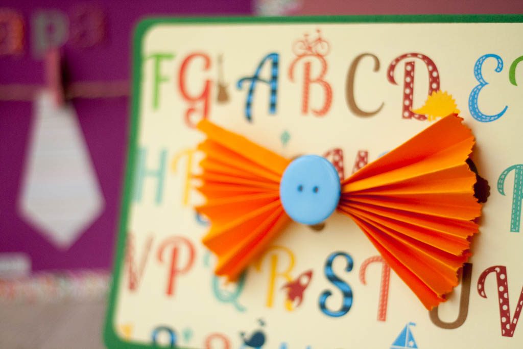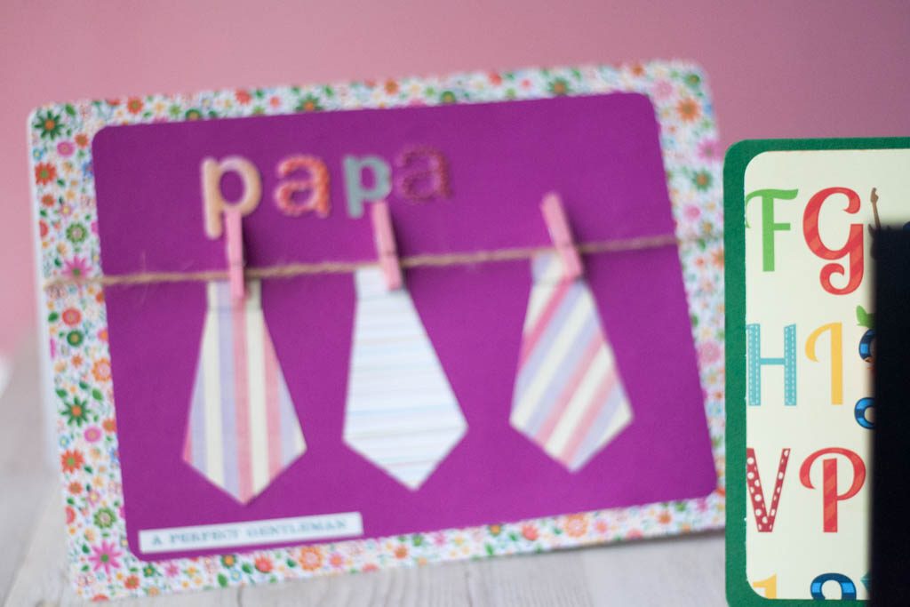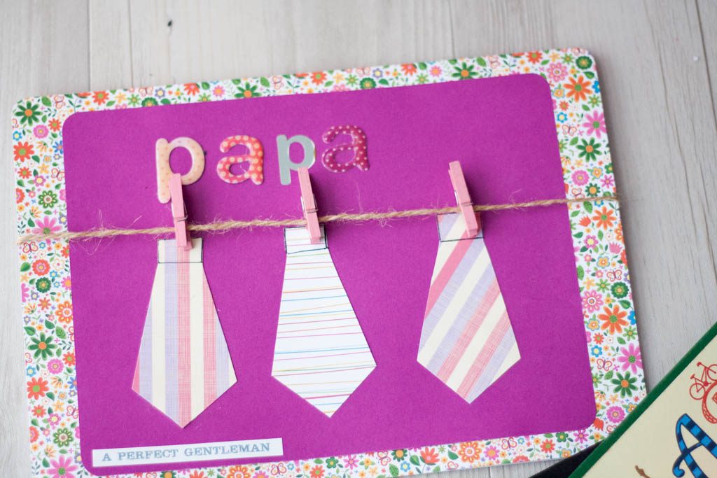Con distintos estampados (pero siempre coordinados) recorta tres corbatas y pegalas sobre la cartulia lisa. Yo he repetdo uno de los estampados para no crear mucho «desorden» ya que el estampado del fondo tiene un patrón muy pequeño.