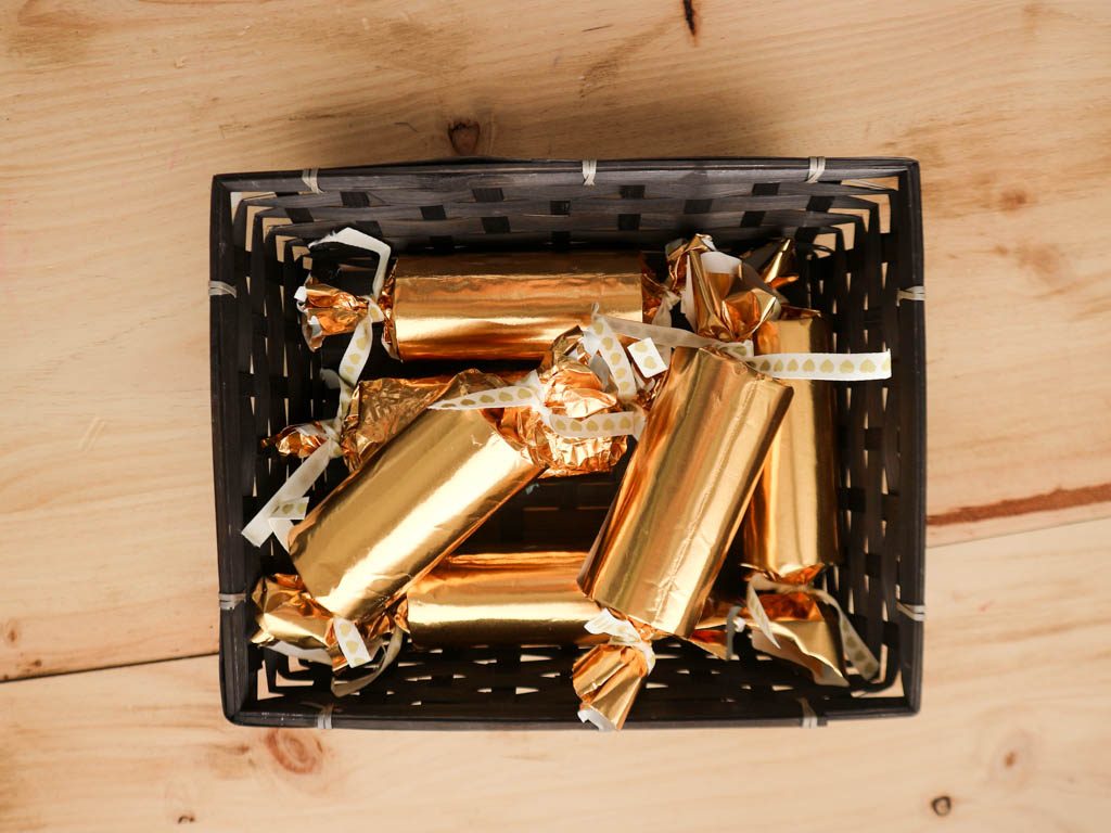 Solo necesitas forrar cada uno de los rollos de papel higiénico con el papel dorado, introducir los regalitos y cerrar los extremos como si fuera un caramelo, usando la cinta.