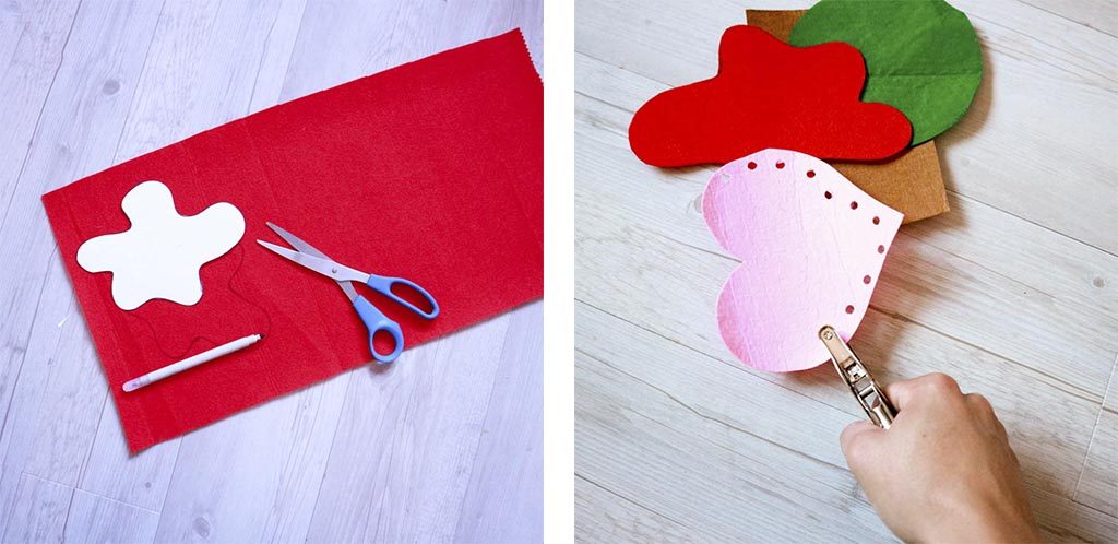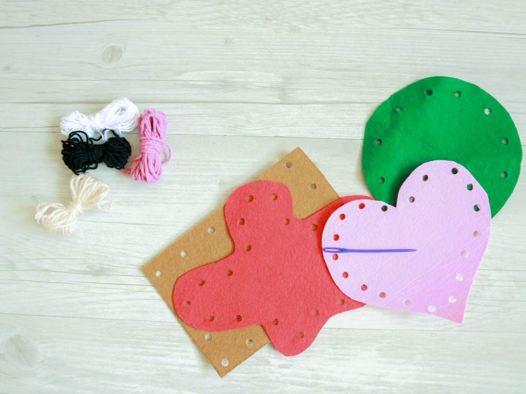 Prepara con antelación las figuras: solo tienes que imprimir las plantillas que encontrarás al final del post y pasarlas a unos pliegos de fieltro o goma eva. Realizar perforaciones alrededor de la figura para que sirva de guia al coser.