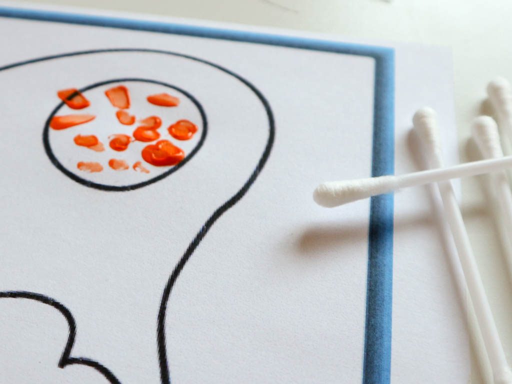 - Pon un poco de pintura en un recipiente para que sea más fácil de acceder para los niños (necesitarás muy poca pintura para esta tecnica)