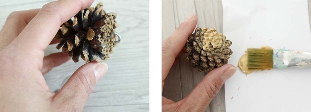 Una vez pintadas, es el momento de colocarles el enganche. La argolla que he usado es un poco más grande de lo que me hubiese gustado. Te recomendo que uses las más pequeñas que encuentres en el mercado porque evitarás que las piñas se partan por la mitad cuando vayas introduciendo la rosca.