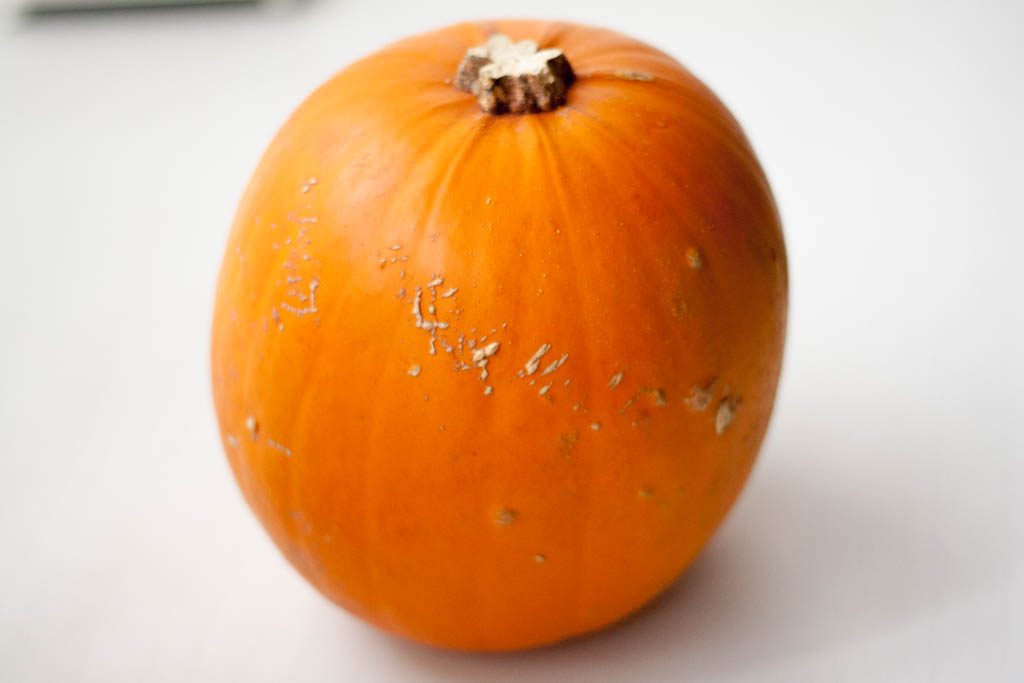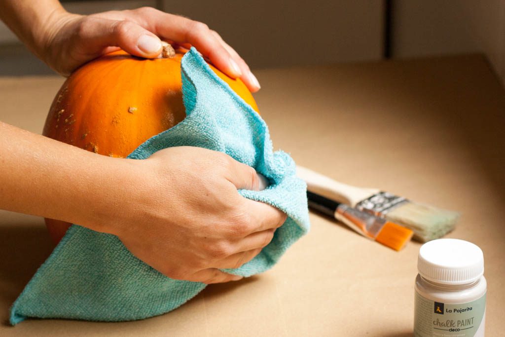 Después de limpiar y secar la calabaza que compramos en lidl, la pintamos con pintura de efecto tiza en color blanco roto. Yo usé la marca La pajarita y el color «sal Ibiza».
