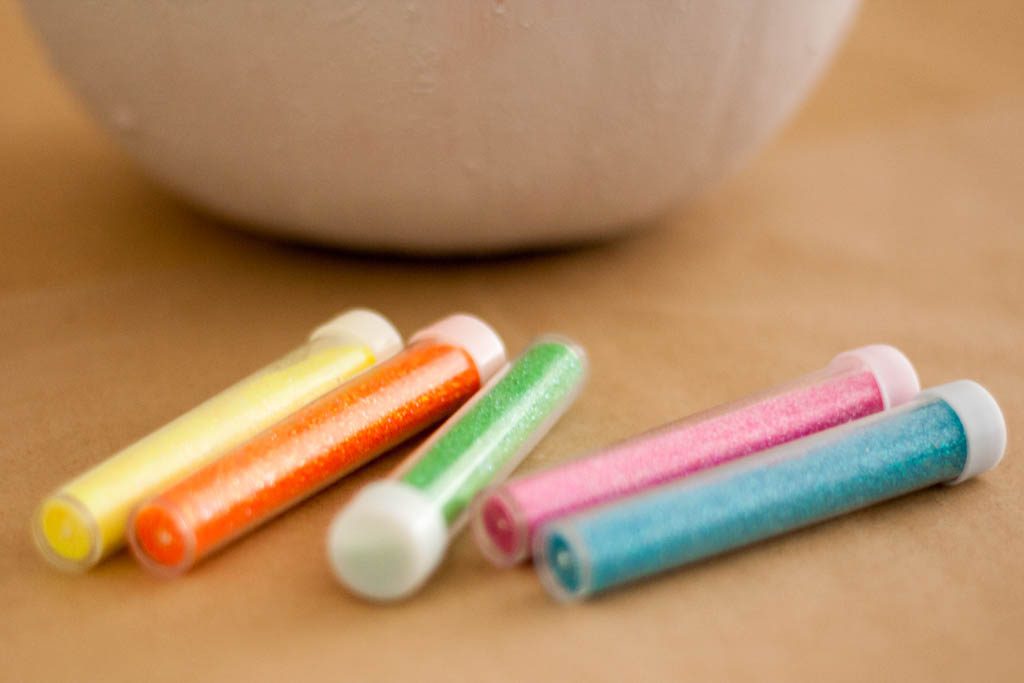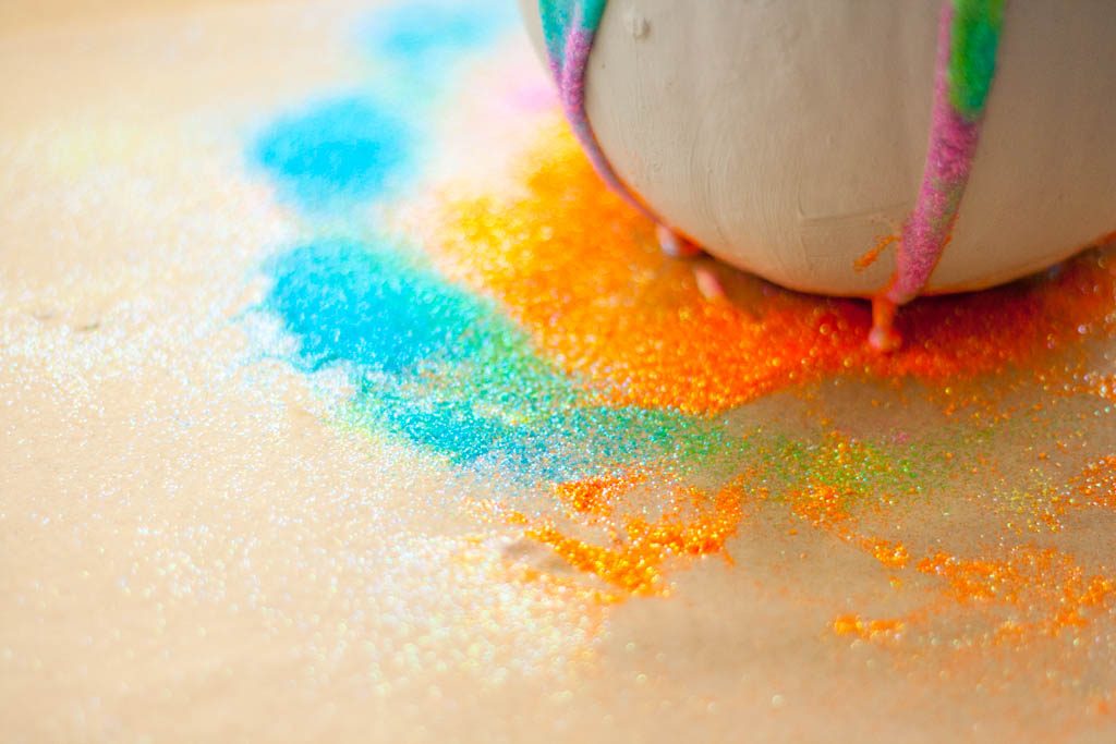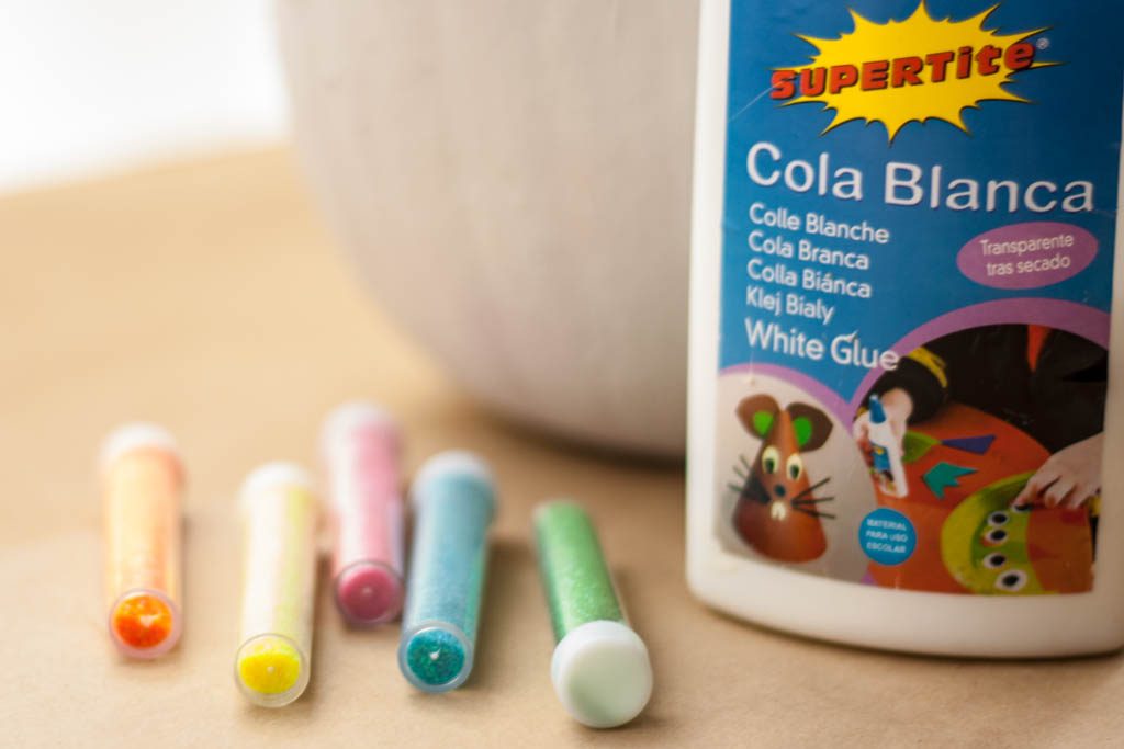 Una vez secas las dos capas que dimos a la calabaza toca la decoración. Cola blanca escolar y purpurina es todo lo que necesitamos.