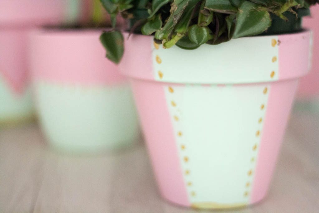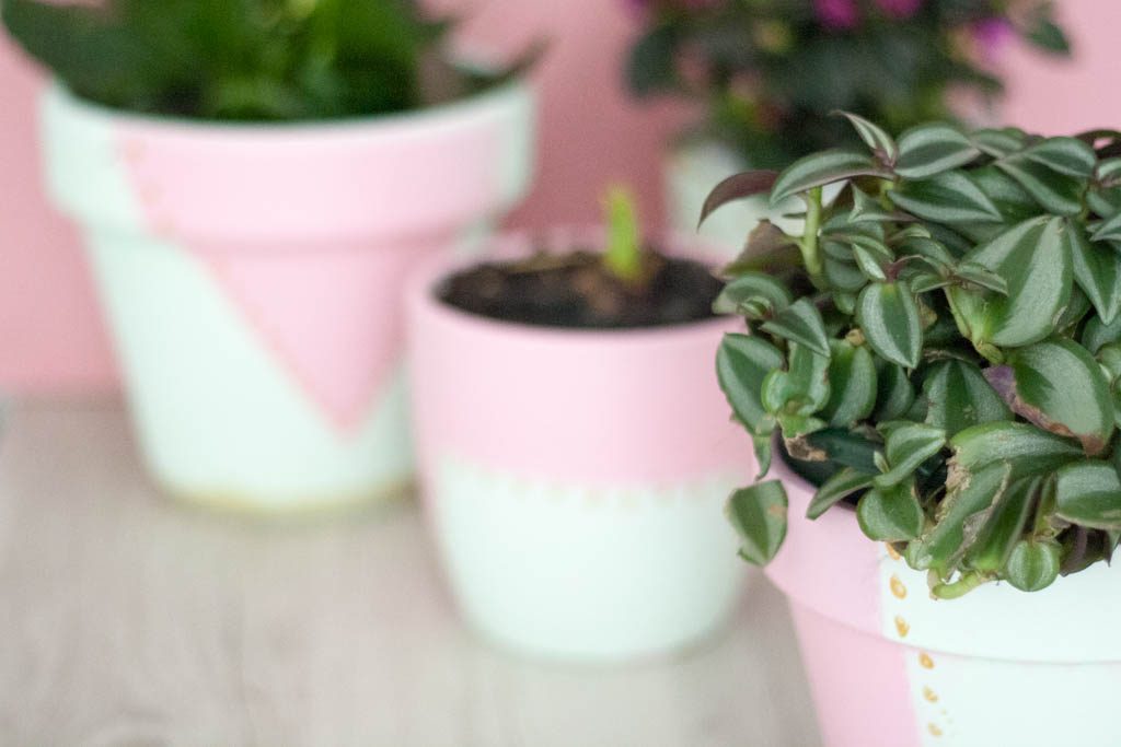 Asegurate de dejar bien pegado la cinta de papel, y vuelve a usar la pintura en spray. La rosa sobre las macetas de color mint y la verde sobre las macetas rosas.