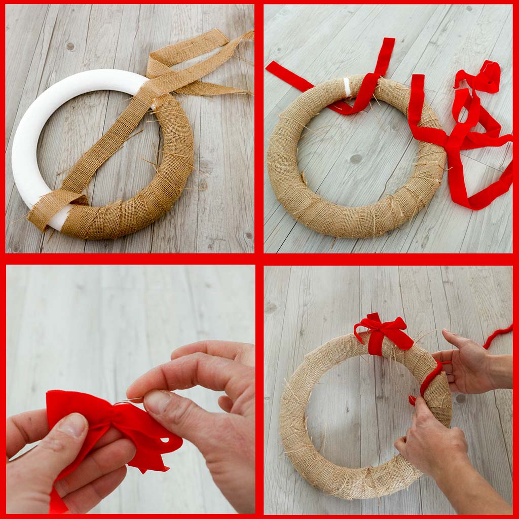 El color natural de la tela de saco queda perfecto con el rojo de la lana y el terciopelo. Pero si lo que buscas es una combinación más arriesgada, solo tienes que cambiar las cintas para un resultado completamente distinto.