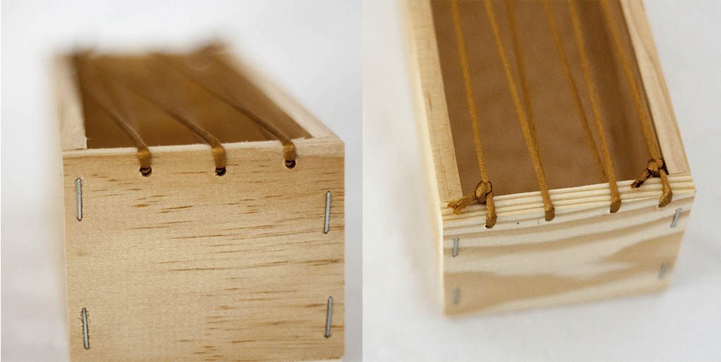 - En uno de los laterales estrechos de la caja, haz agujeros cada dos centimetros empezando a 1 cm del borde.