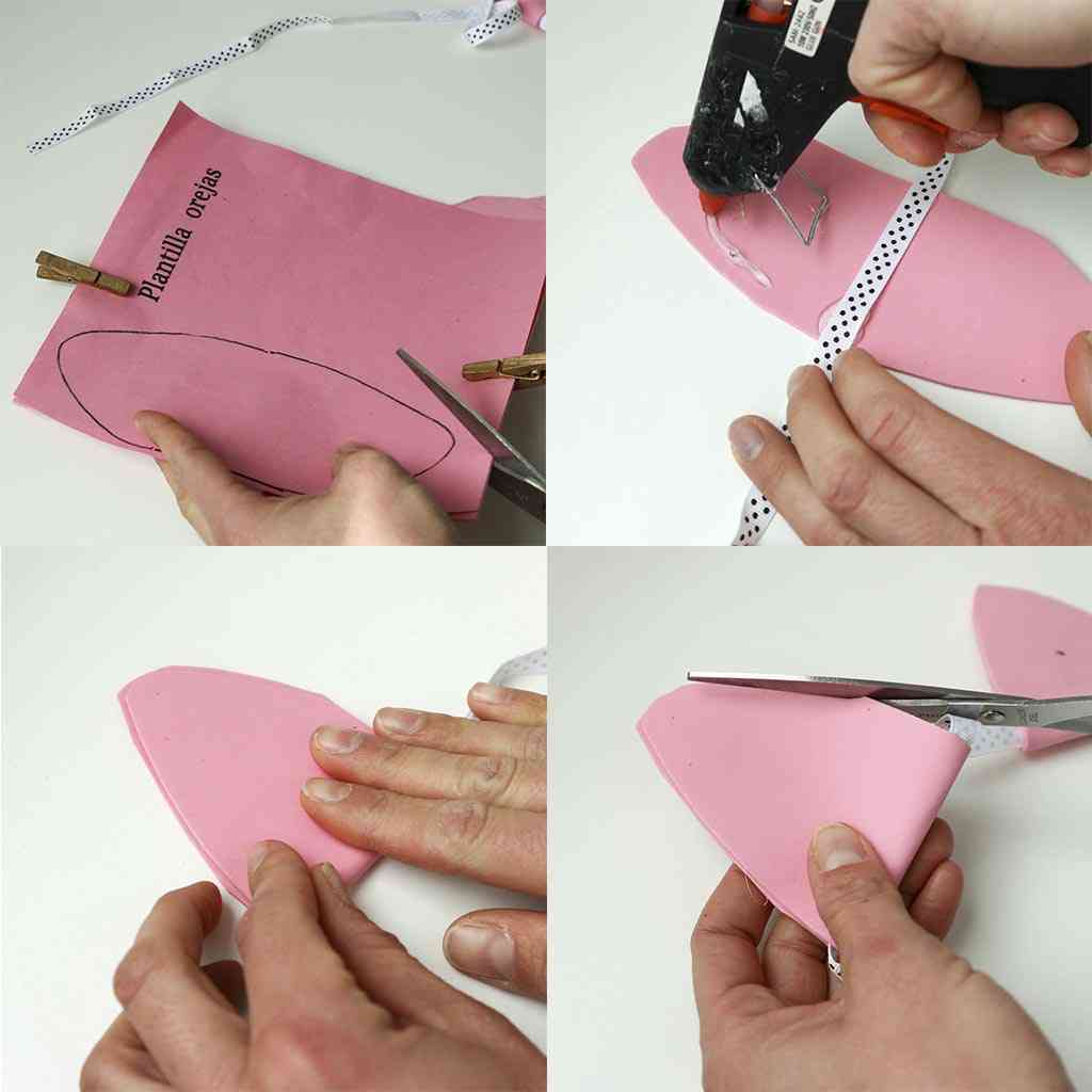 - Con ayuda de la pistola de pegamento, pega la cinta en la mitad de la oreja. Coloca la otra oreja a una distancia de 3 cm.