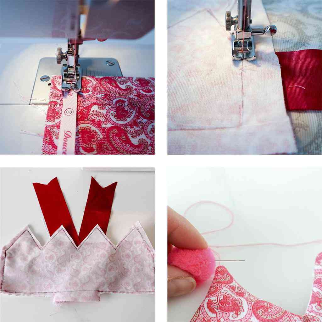 - Antes de cortar o coser la corona, necesitarás poner los adornos que hayas decidido que decorarán la parte frontal de la corono: cintas, pasamaneria, puntilla. Situala en la parte inferior de la corona y haz un pespunte sencillo para unir la cinta a la tela.