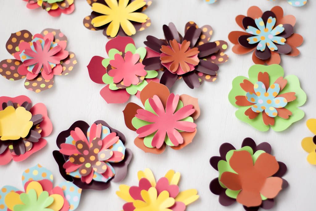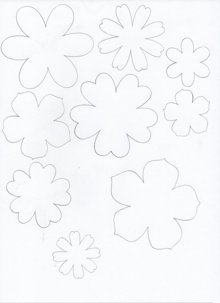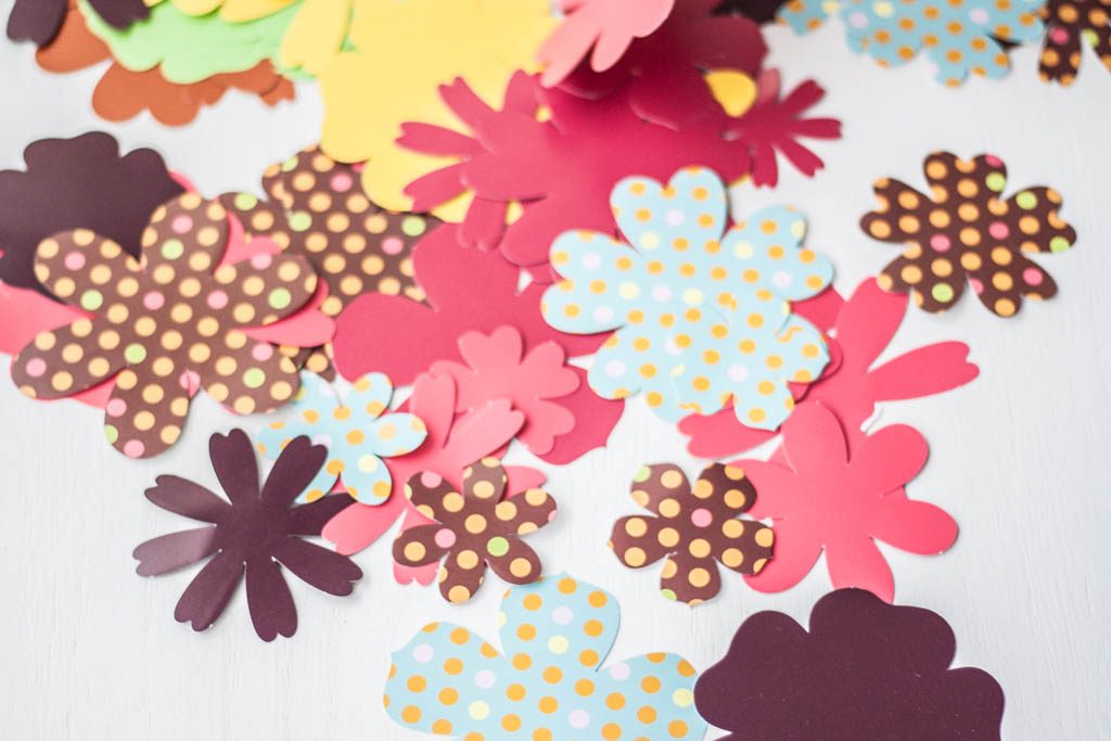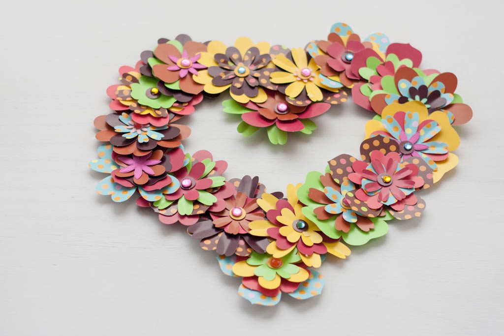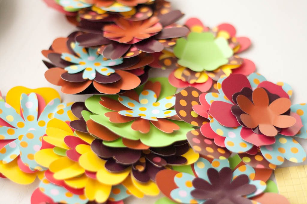 Descarga la plantilla imprimible (al final del post) y recorta sobre papeles de scrap. Necesitarás flores suficientes para completar la corona.