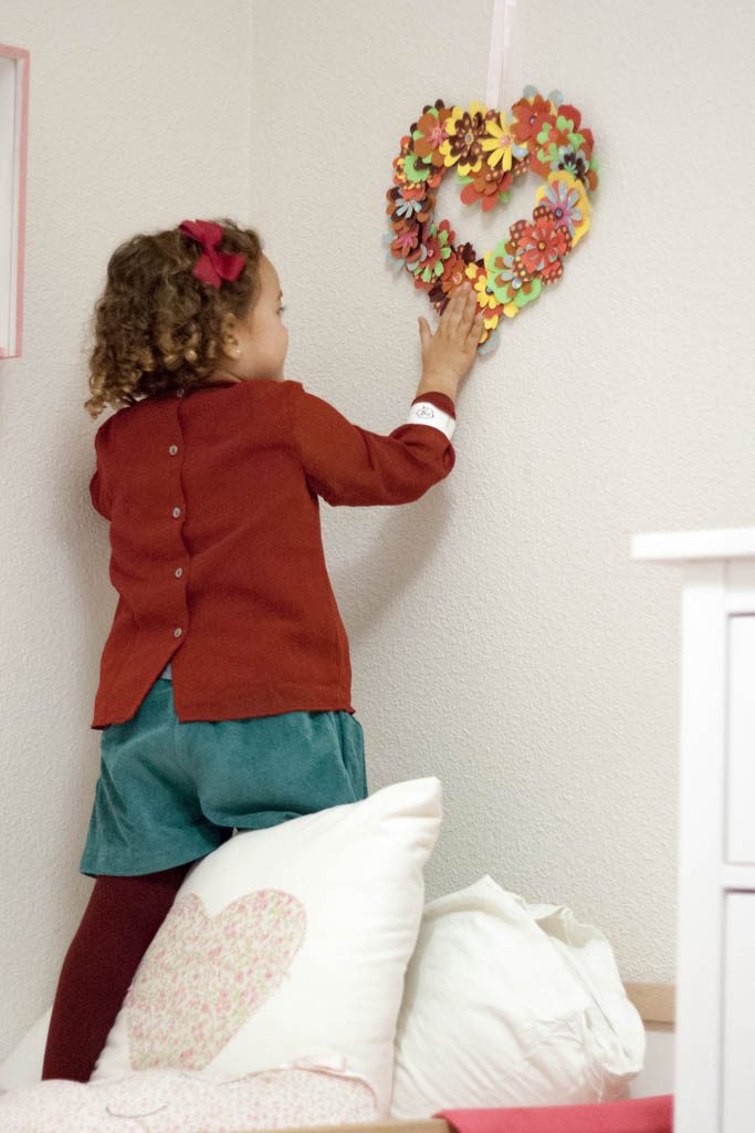 Para decorar el cabecero de la cama, hemos hecho entre las dos esta corona de papel.