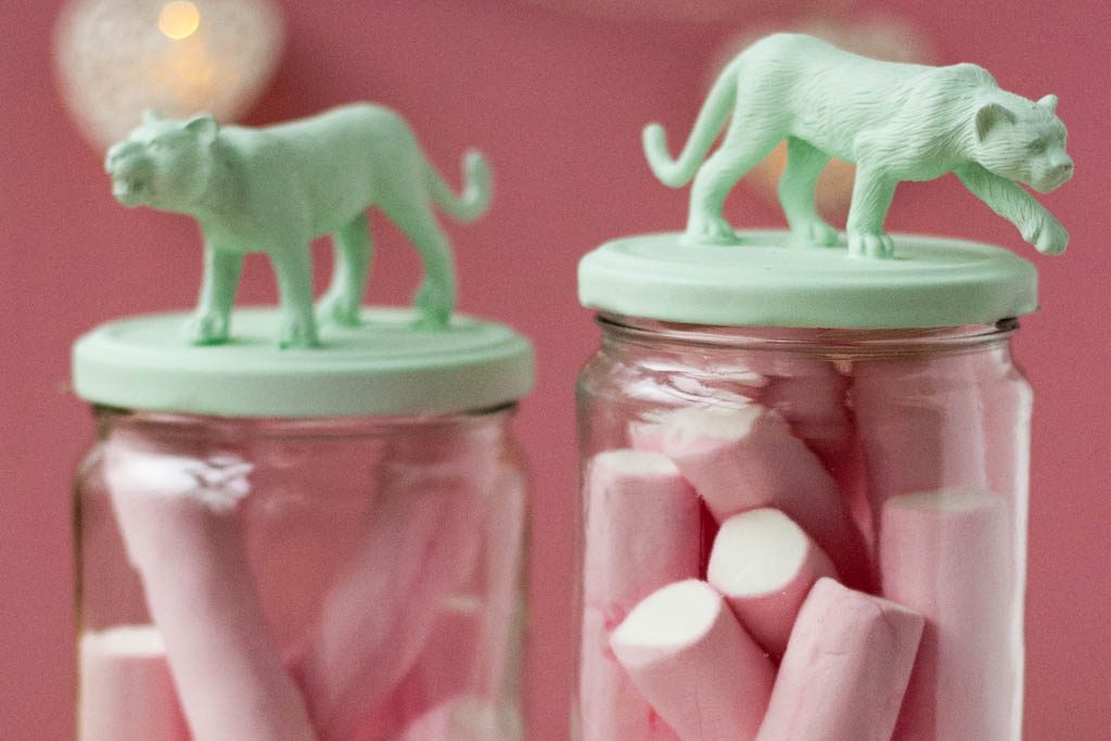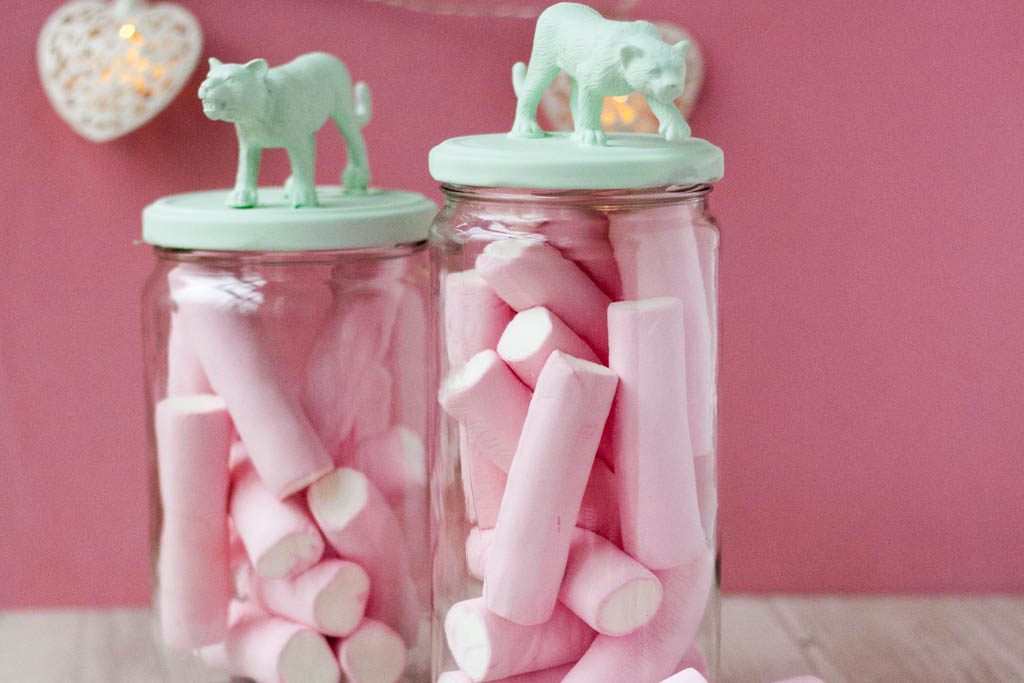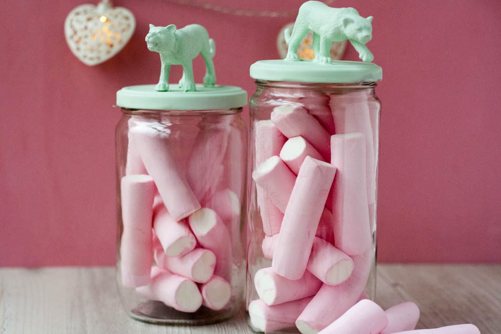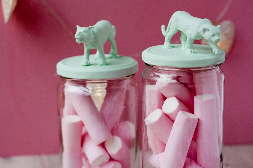 Con unos botes de cristal y algunos animales de plástico tendrás unos recipientes para las golosinas del cumpleaños.