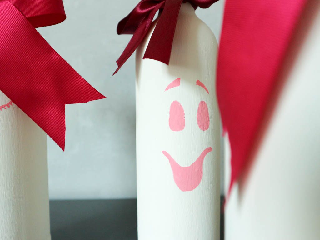 Una vez que la base de la botella está completamente pintada y seca, usando un rotulador de color rosa, he dibujado los ojos y la boca de cada uno de los fantasmas. Con pintura acrilica y con ayuda de un pincel fino, he rellenado los dibujos hechos con el rotulador.