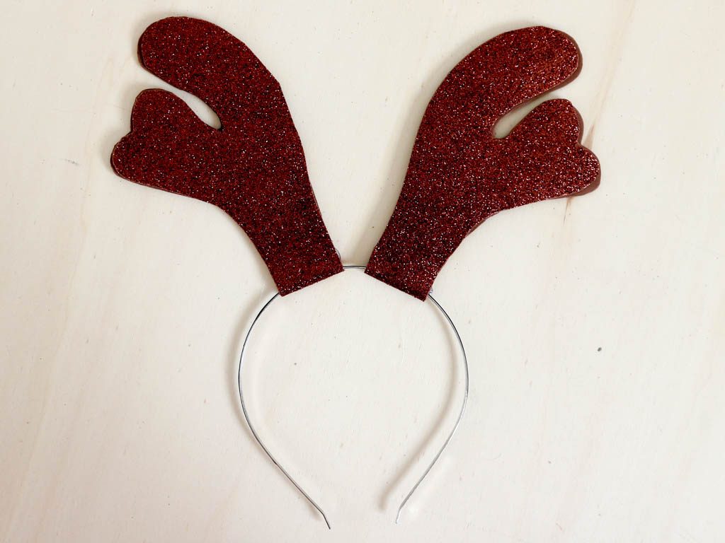 - Dobla los cuernos de reno por la mitad y coloca la diadema en el medio.