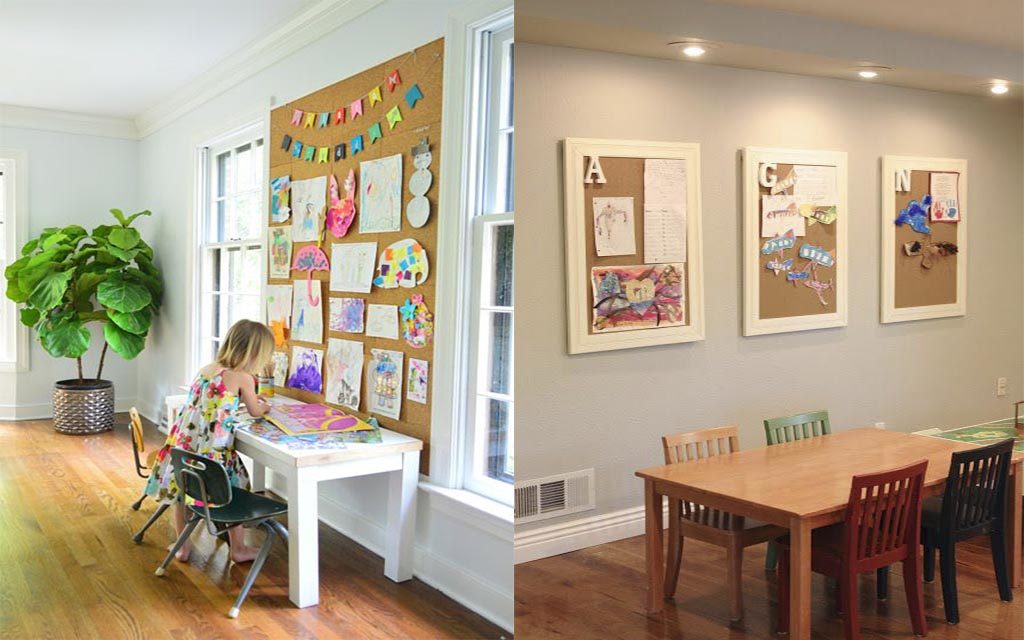 El corcho es la manera más cómoda para exponer dibujos. Es ideal si tienes una habitación de juegos o una zona de arte en casa.