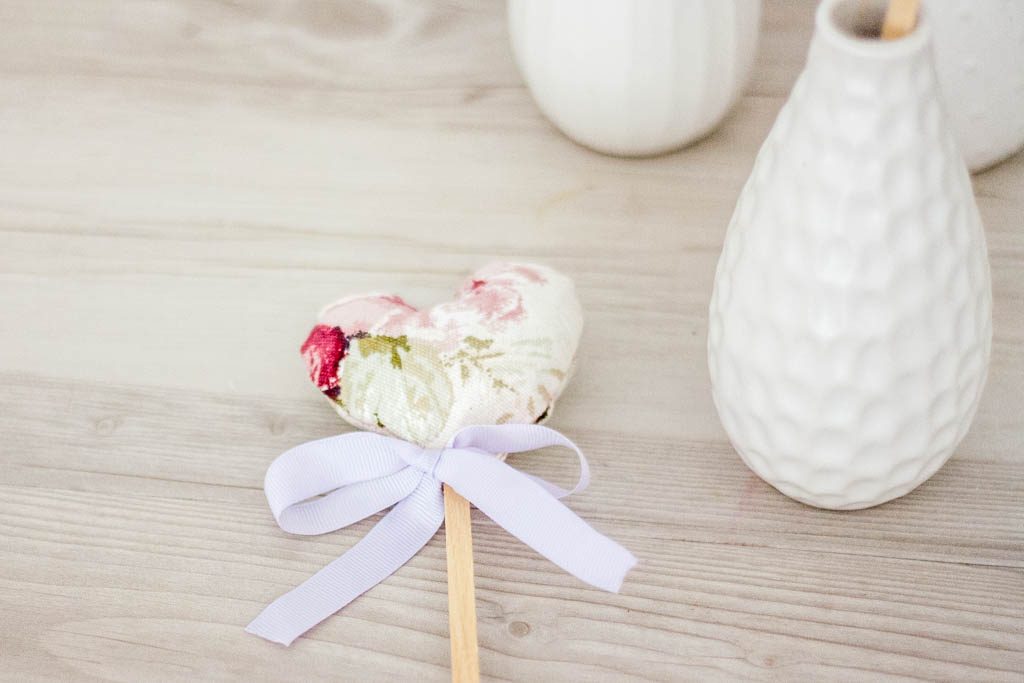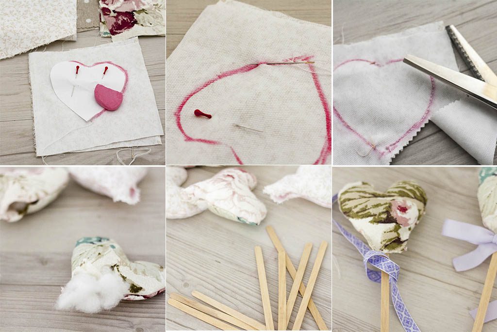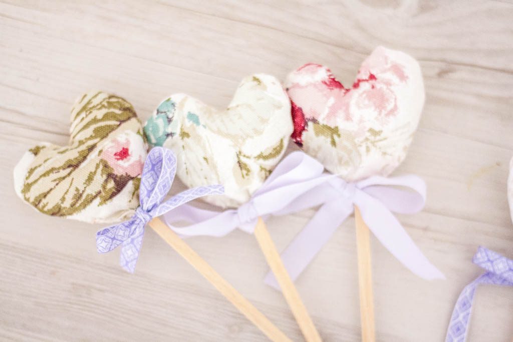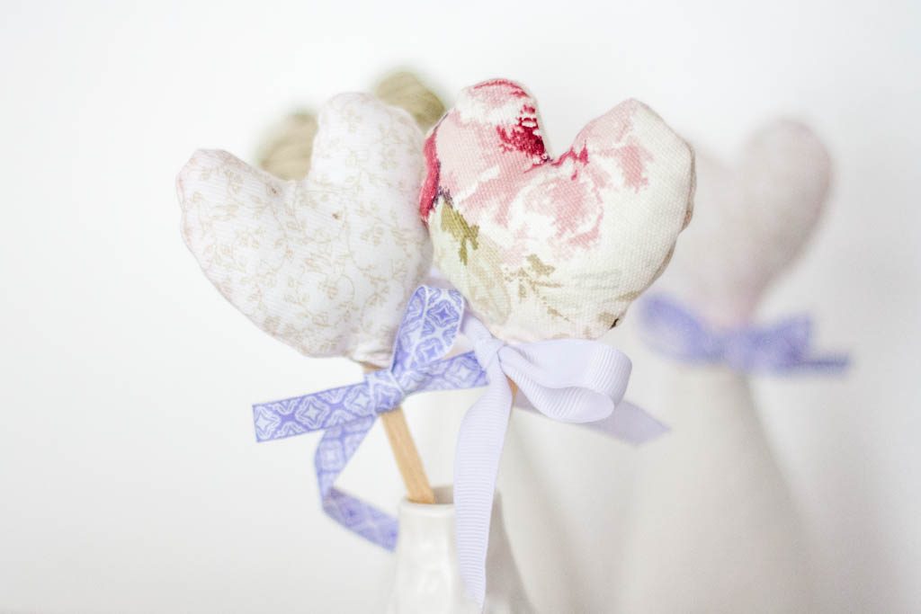 Con unos pocos retales, unos palo y unos lazos hemos creado unos corazones que podrás pinchar en una maceta o juntar para hacer un centro.