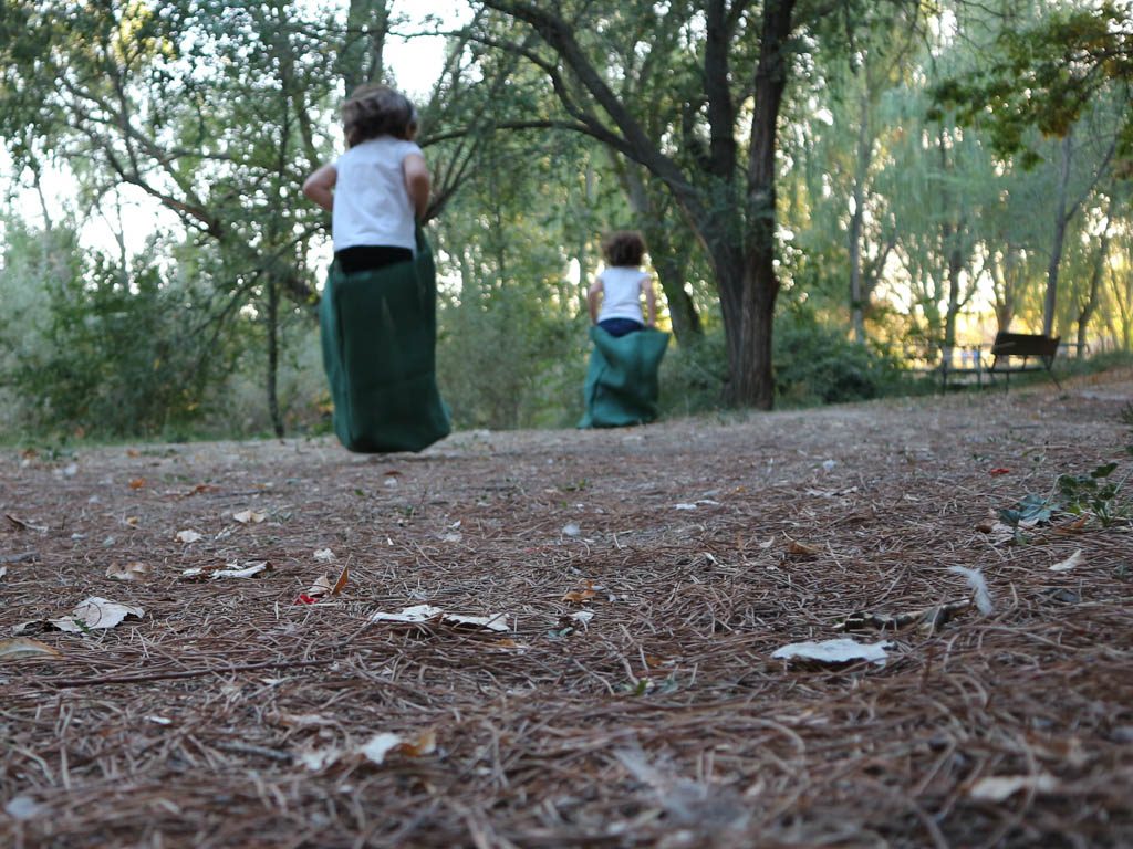 Los niños, cuando están en el campo no necesitan mucho entretenimiento, pero, por si acaso, nos llevamos unos sacos para organizar algunas carreras. Correr no corrieron mucho, pero se lo pasaron genial.