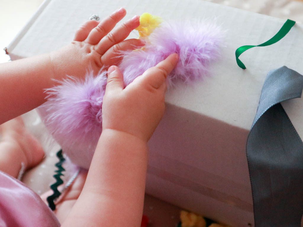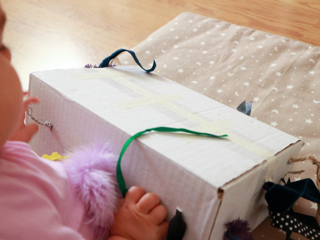 Basándome en esta idea, he creado una caja sensorial con distintas cintas que permiten tirar de ellas sin problemas.