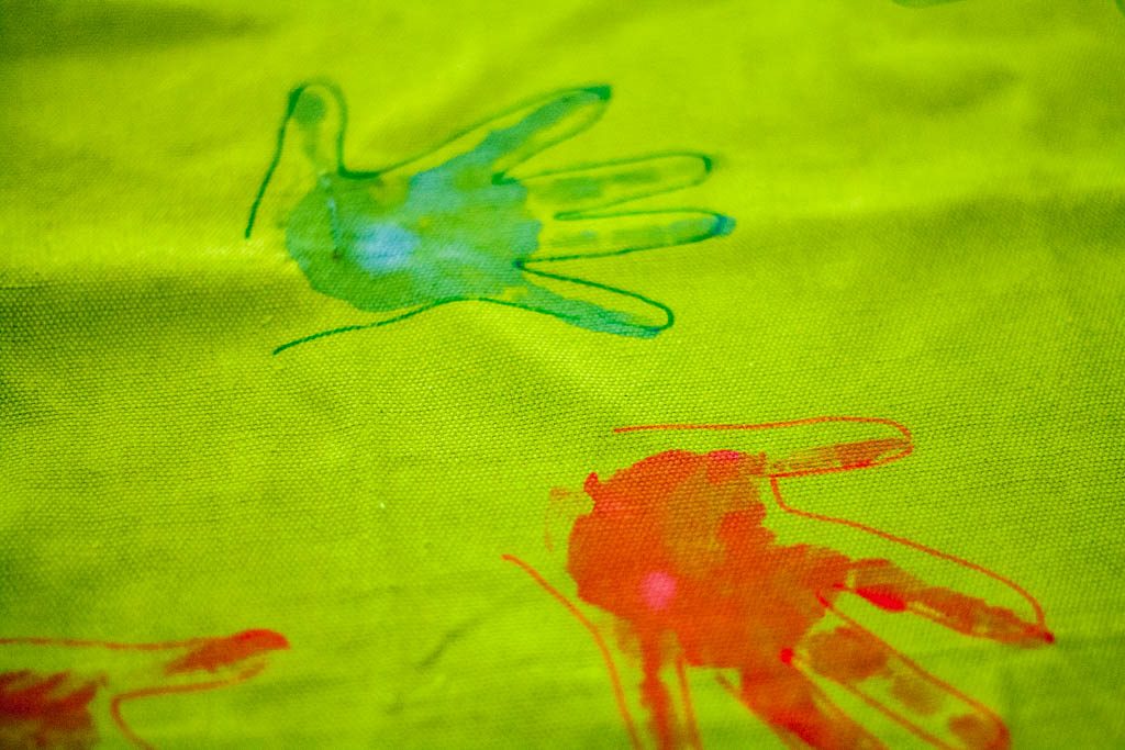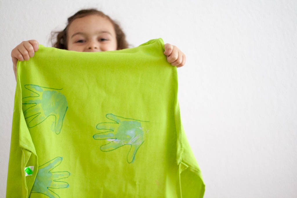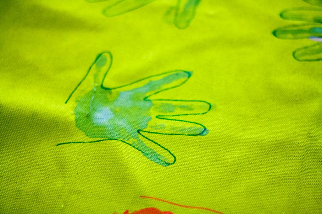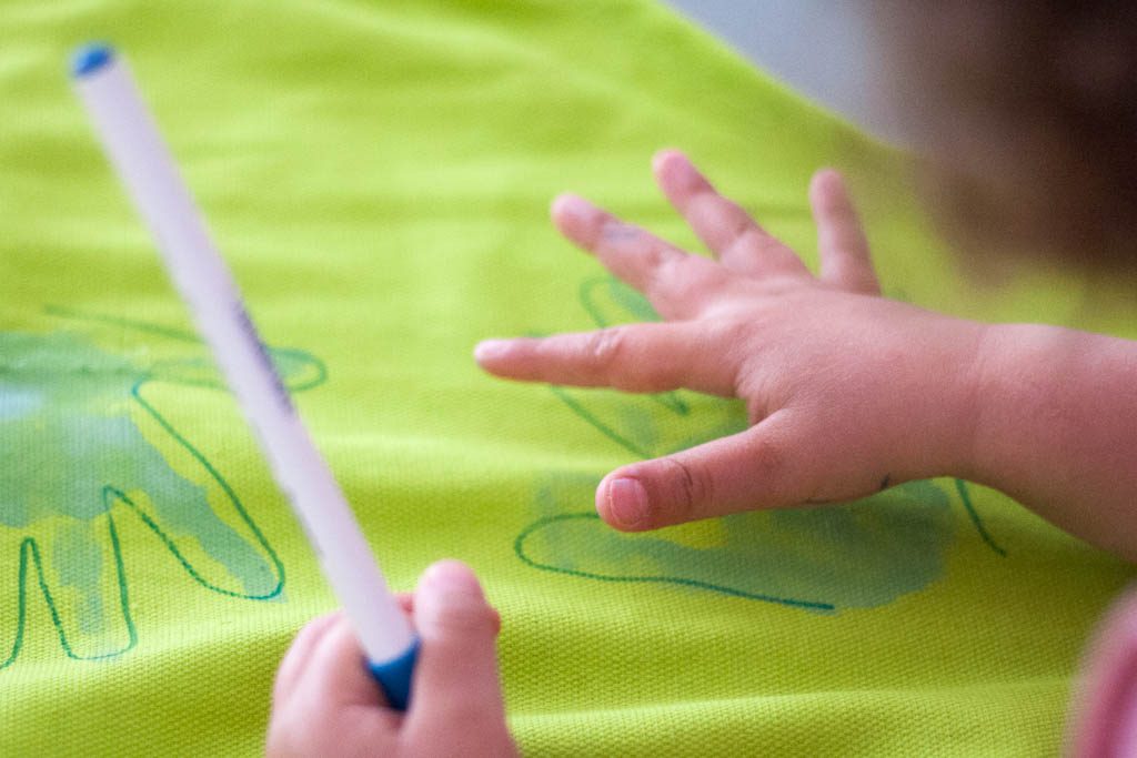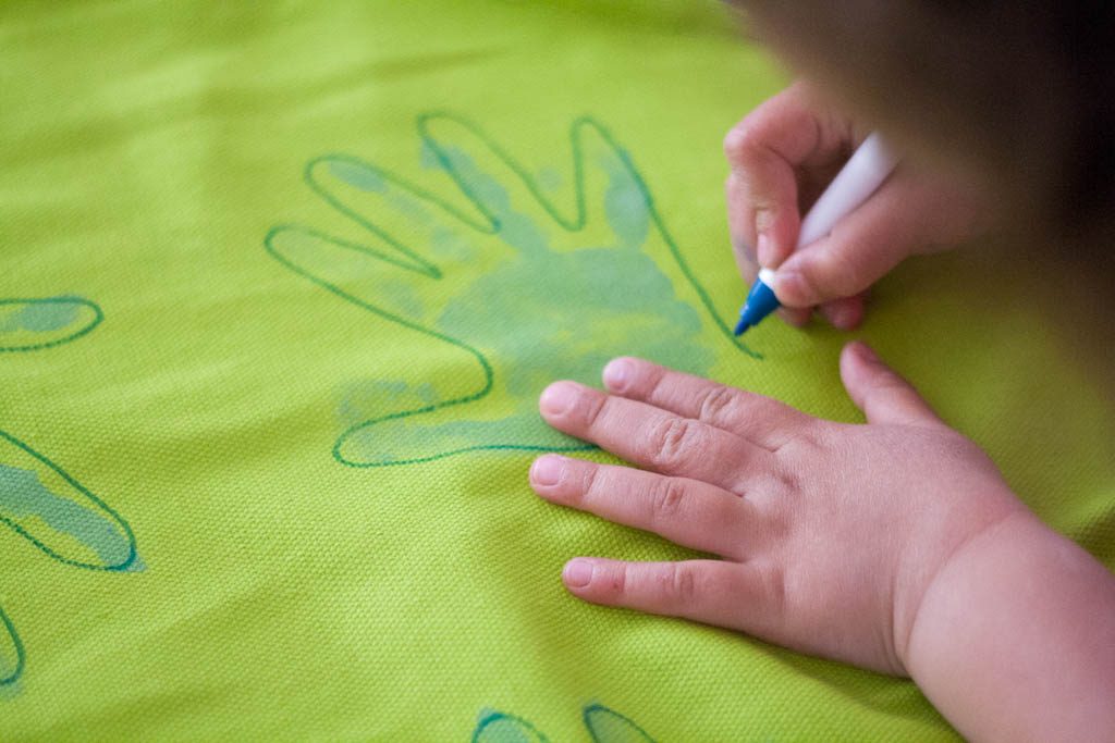 Con rotuladores para textil he marcado la silueta de la mano y hemos escrito el nombre del niño.