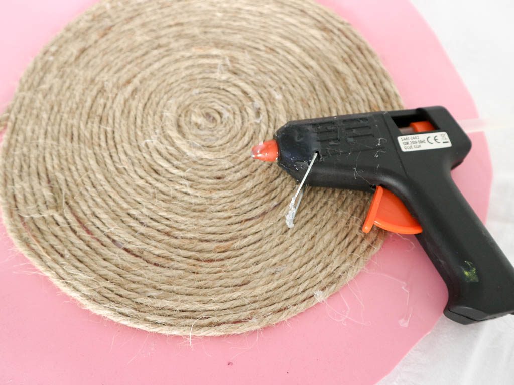 - Con ayuda de la pistola de silicona, fija el comienzo de la cuerda en el centro del salvamantel.