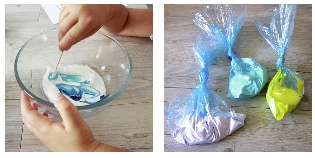 - Pon la mezcla coloreada dentro de una bolsa de plástico para congelados y haz un nudo.