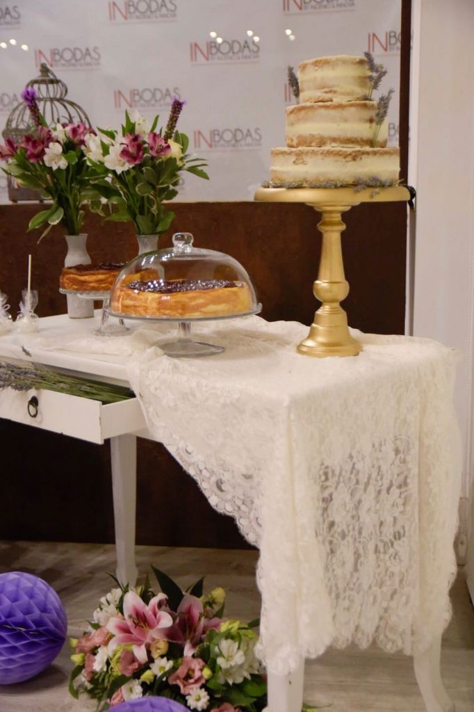 En esta ocasión decidimos dejar una mesa para poner todas las tartas juntas. Sobre un escritorio antiguo, decorado con una mantilla, se colocaron tres tartas: dos tartas de queso y una naked cake de tres pisos. La mesa se completo con flores naturales y lavanda.