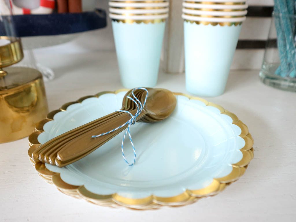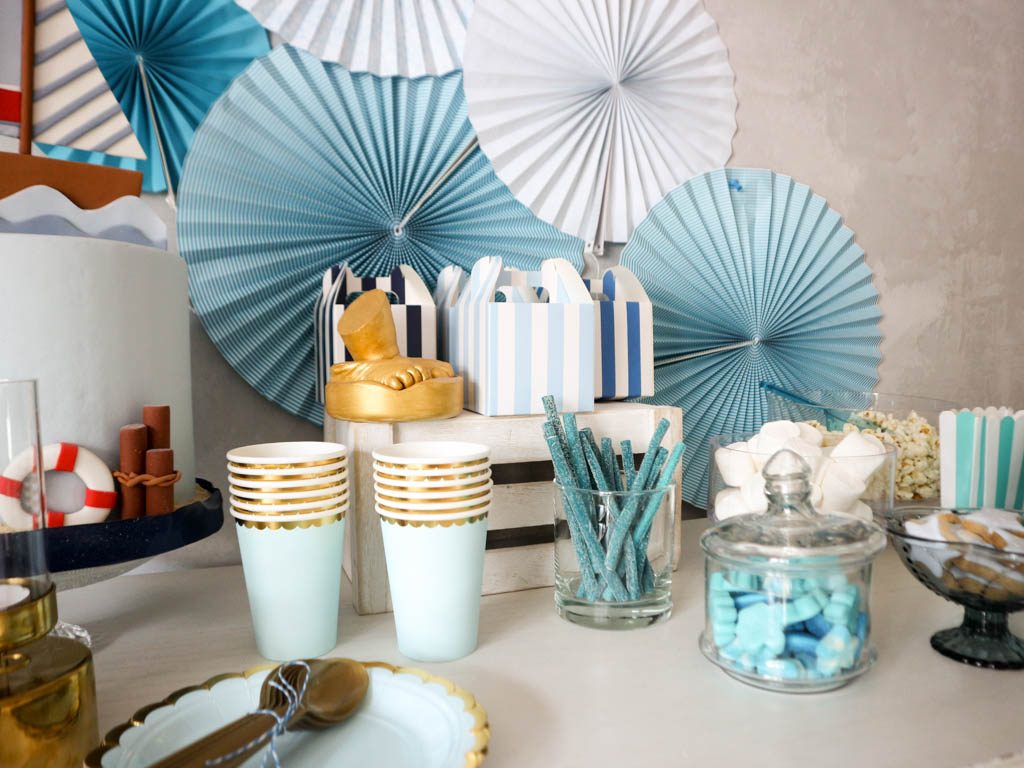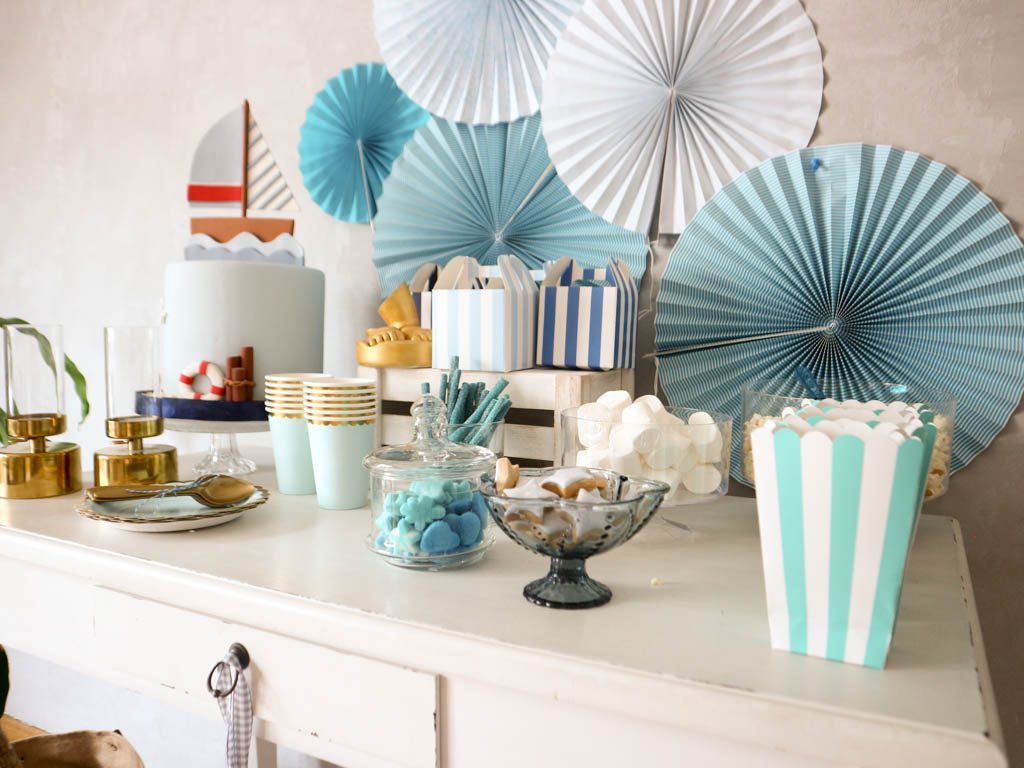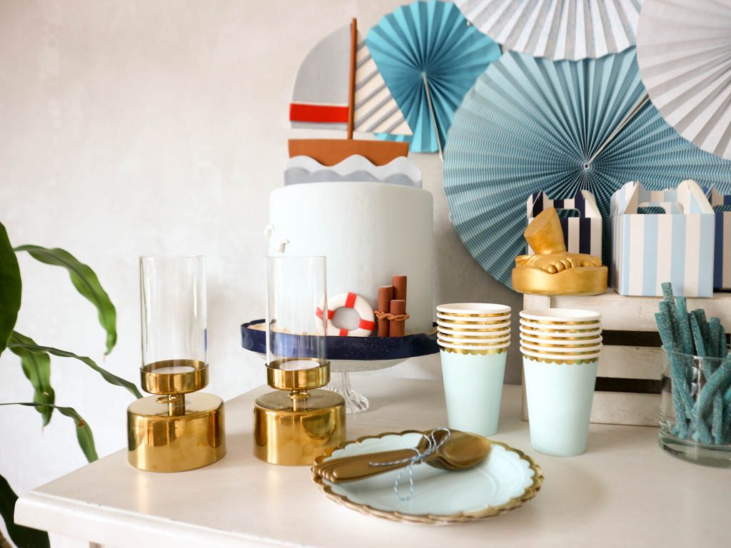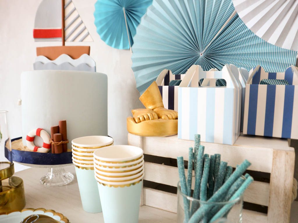 En esta ocasión he usado colores celeste combinados con dorados para decorar una mesa sencilla, presidida por la tarta y con pequeños complementos.