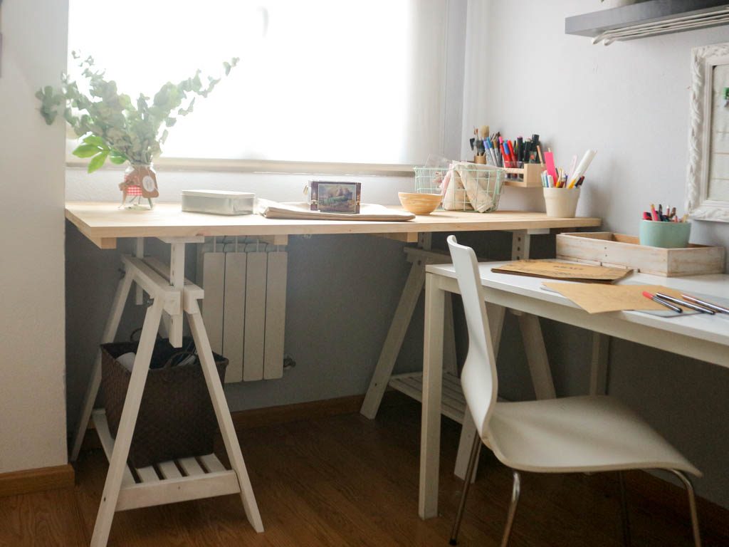- Pintura para muebles. Para la nueva mesa quería reutilizar unas viejas borriquetas de Ikea que había conocido mejores épocas. Una mano de pintura blanca efecto tiza era lo que necesitaban para recuperar protagonismo.