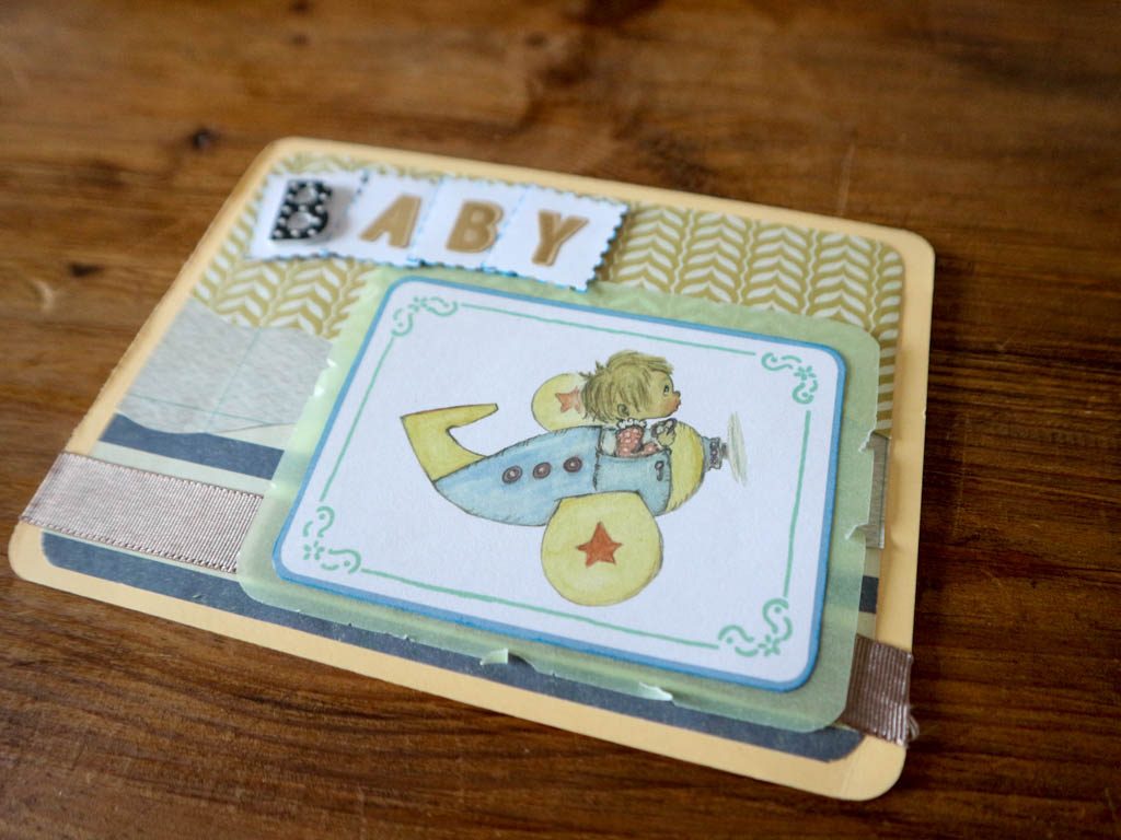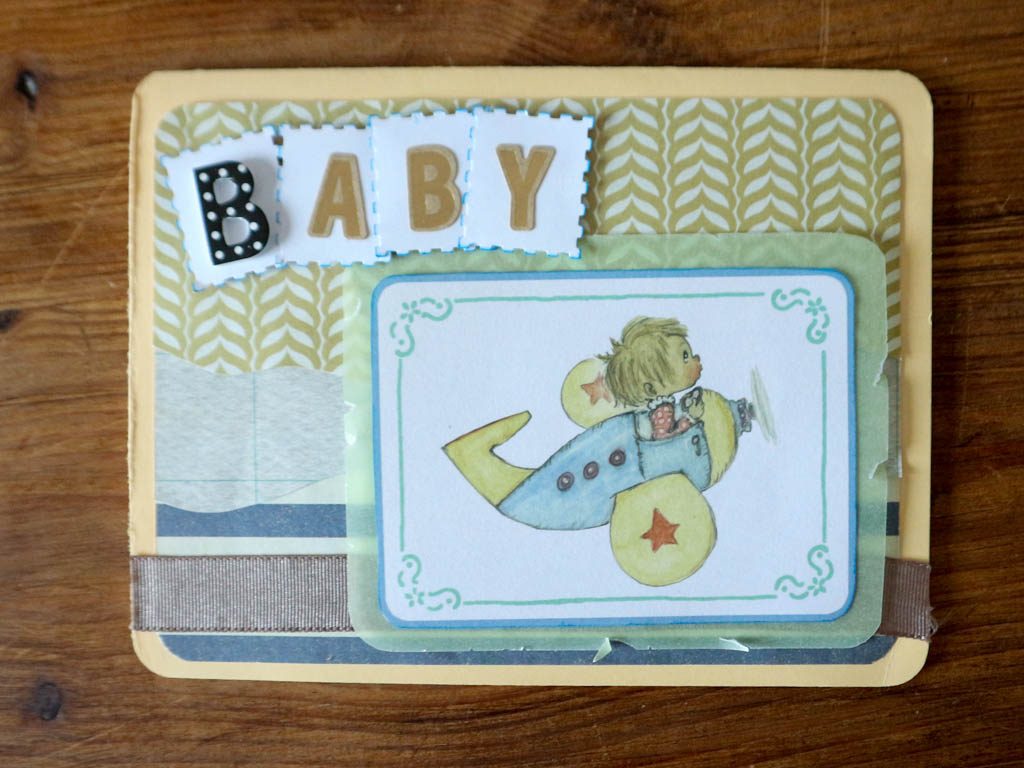 En la parte baja de la tarjeta he añadido un lazo de color marrón y sobre ella una ilustración de un bebé. Puedes encontrar estas ilustraciones en algunos papeles decorados y recortarla o puedes imprimirla, dibujarla o estampar… las posibilidades son infinitas. Para destacar la ilustración, la he fijado sobre un papel traslúcido al que le he desgastado los bordes con el filo de las tijeras-