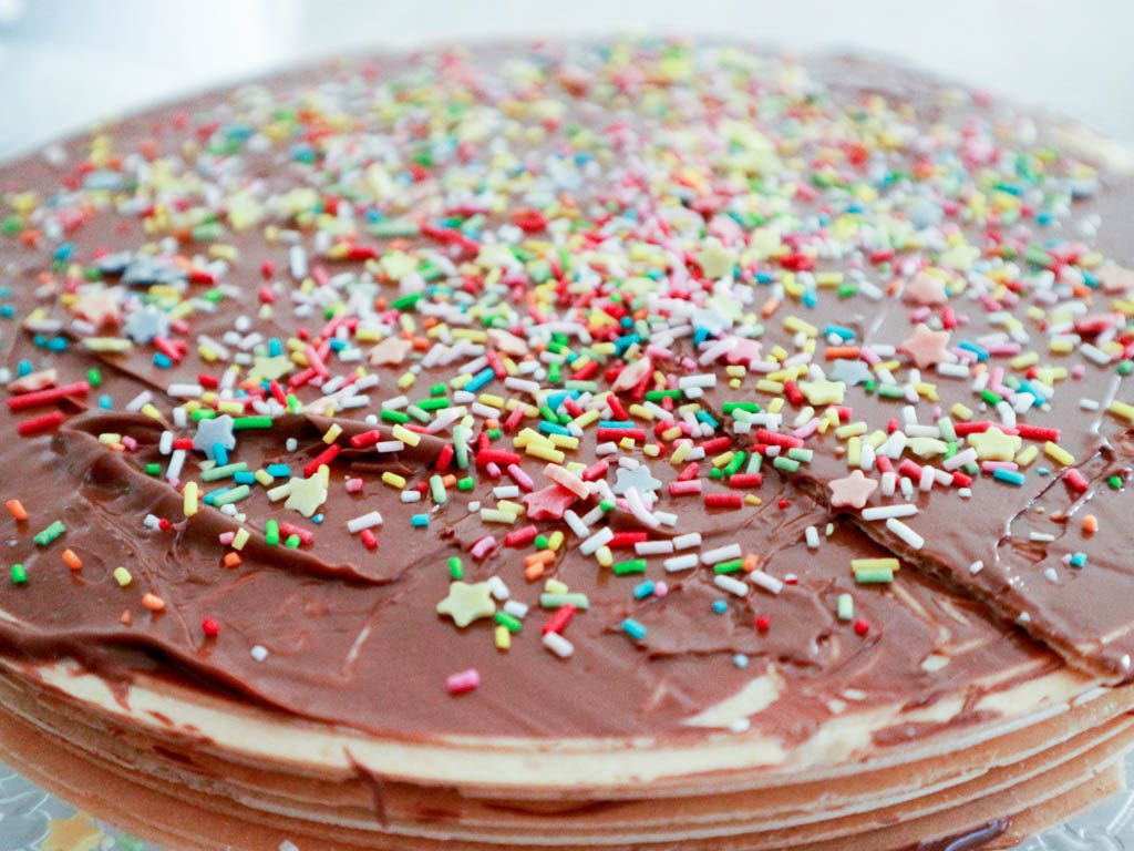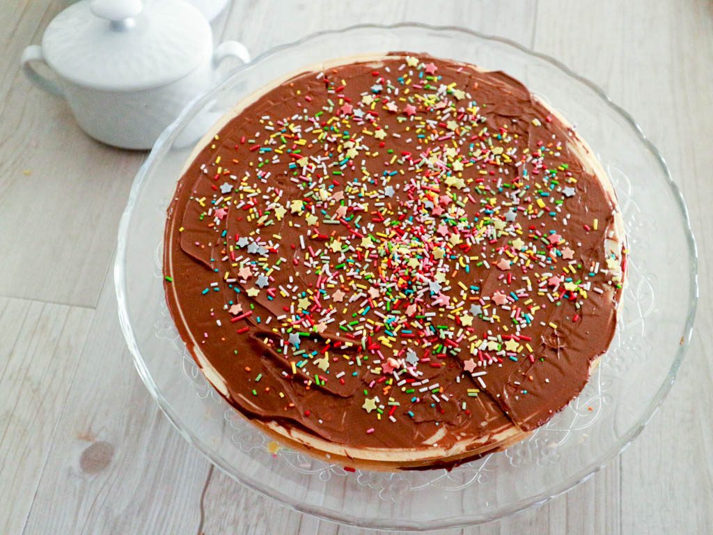 - Finaliza la tarta con una capa de crema de cacao y sobre ella, reparte los sprinkles para decorar.