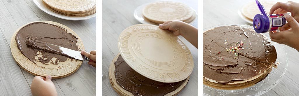 - Vuelve a colocar una oblea encima de la crema de cacao y repite la operación hasta finalizar toda la tarta.