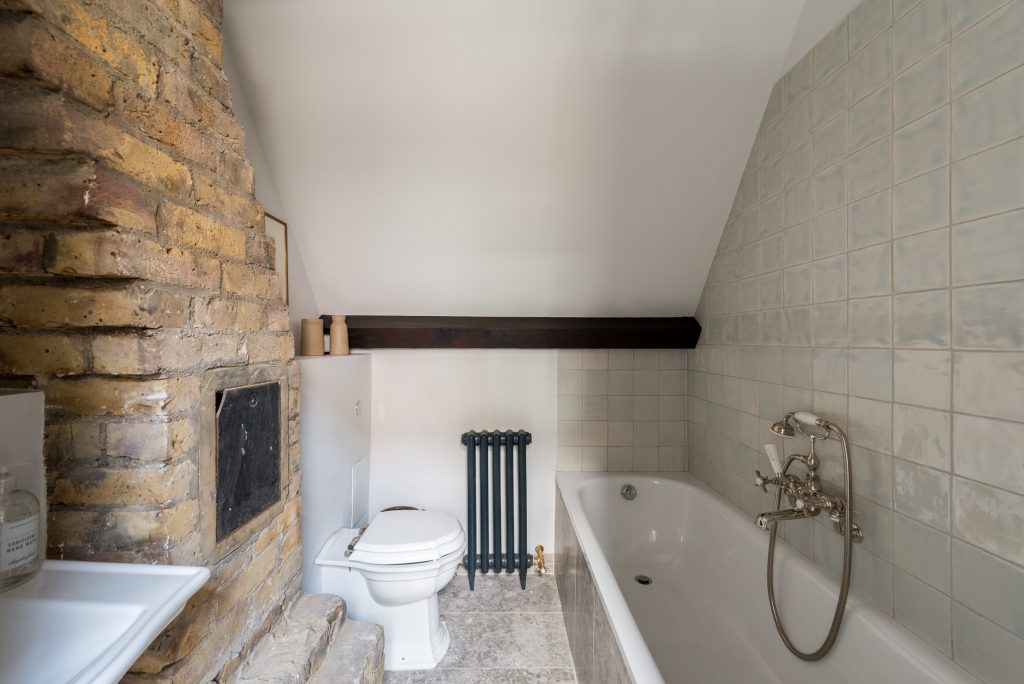 La chimenea dentro del cuarto de baño invita a largos baños de espuma en invierno.