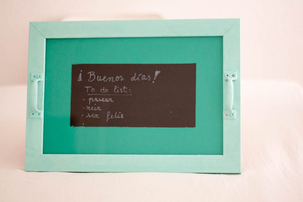 4. Pinta el marco, la trasera y los tiradores. Yo he usado pintura de pizarra para poder dejar mensajes escritos con tiza.
