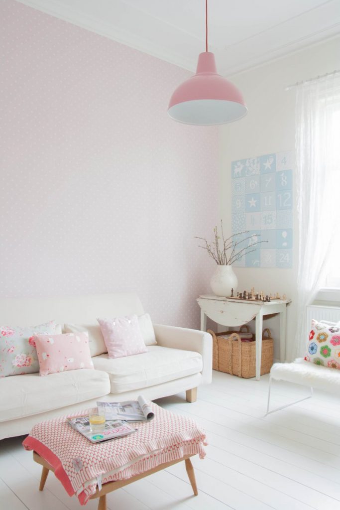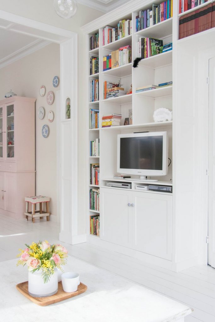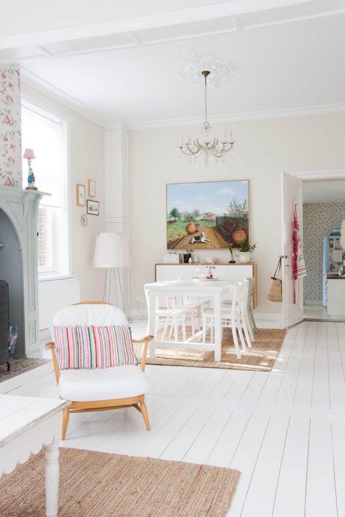 No es fácil que un ambiente donde predomina el blanco sea tan acogedor, pero las alfombras de fibras naturales y los textiles lo consiguen. Los muebles de madera pintados en blanco y rosa acentúan la personalidad de este piso.