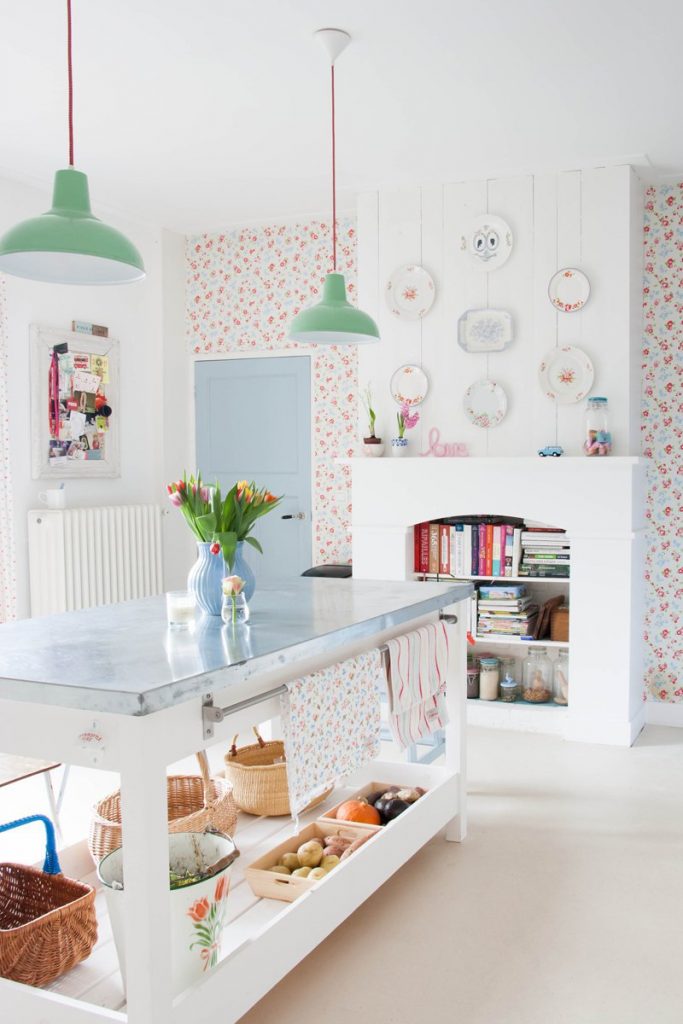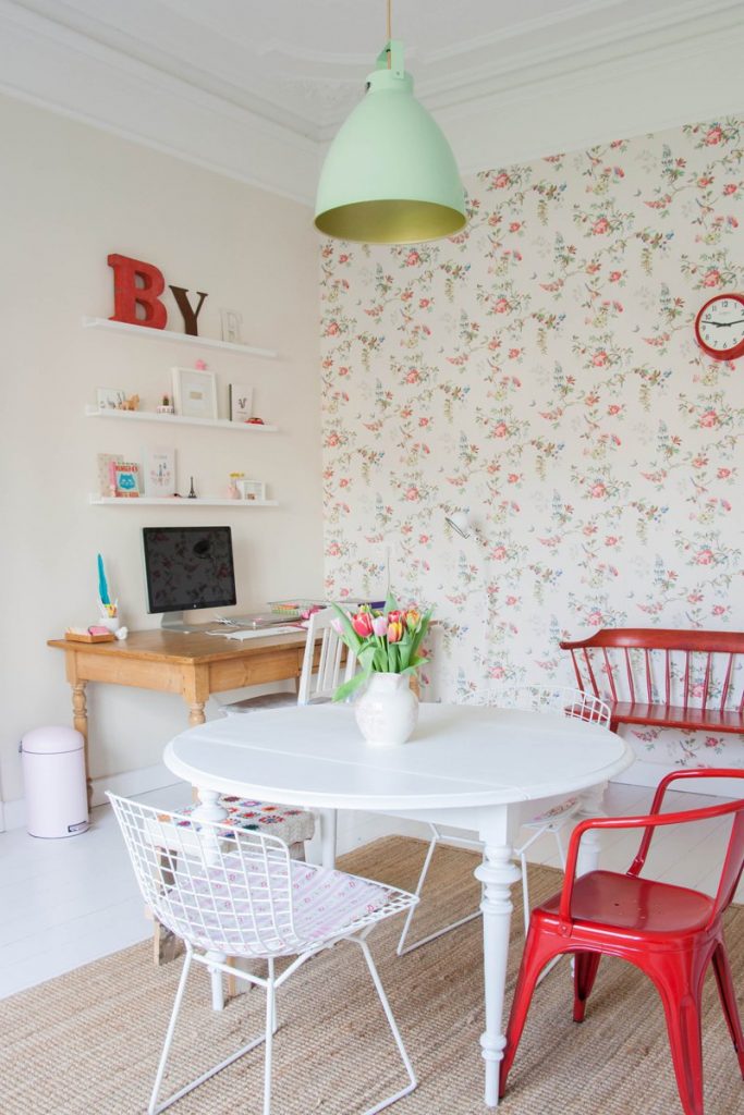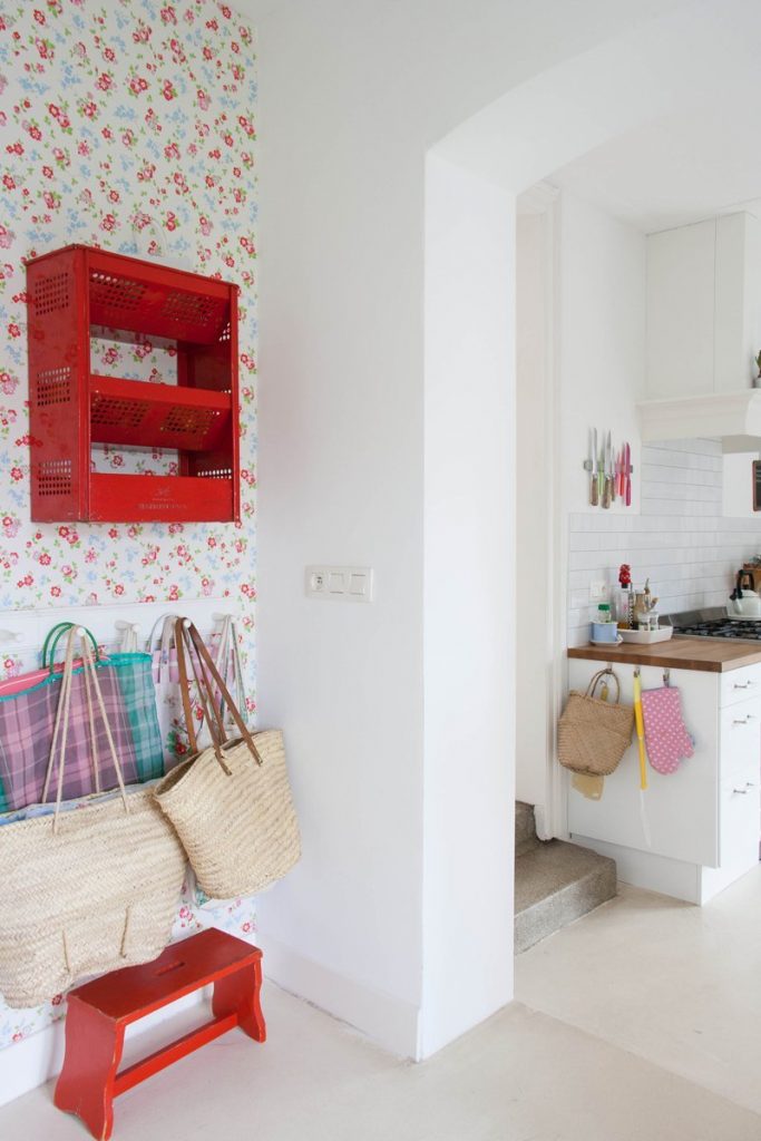 Soy una fiel defensora de las cocinas abiertas y me encanta el recurso del papel pintado en la cocina para unificar ambientes. El color rojo presente en la cocina y el salón da continuidad a las estancias.