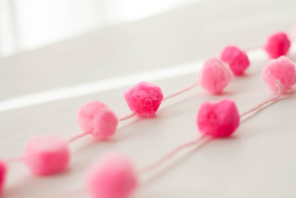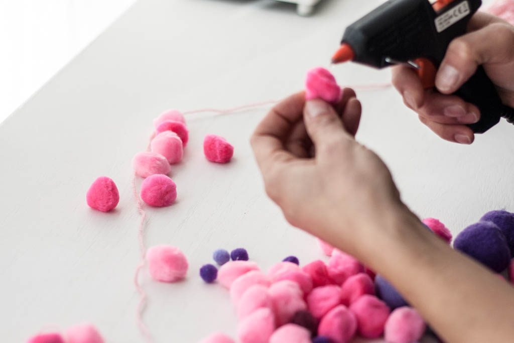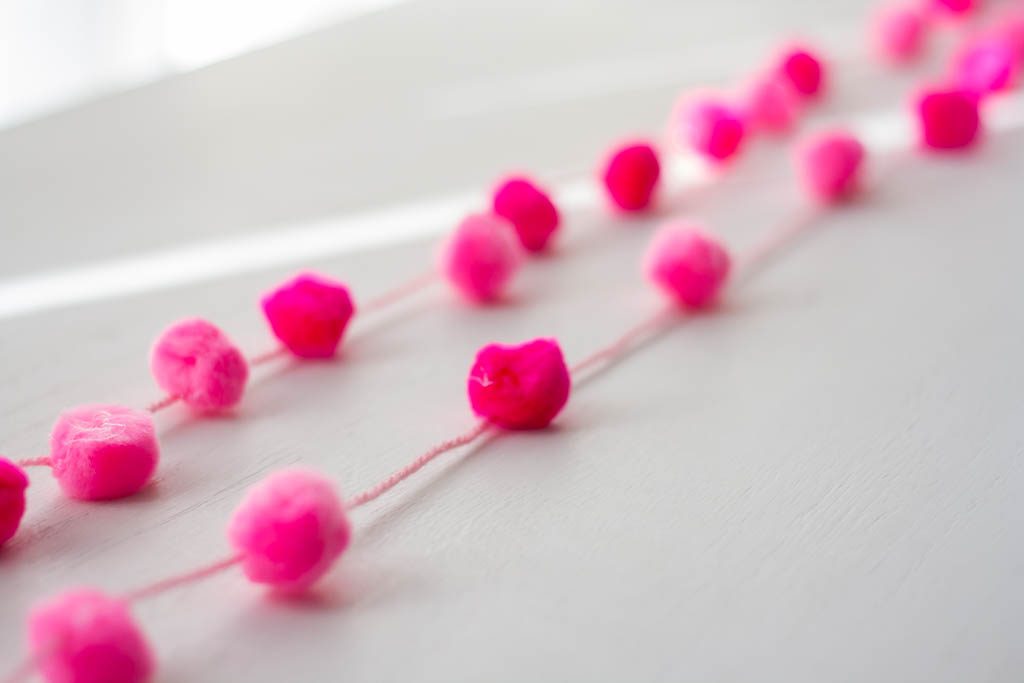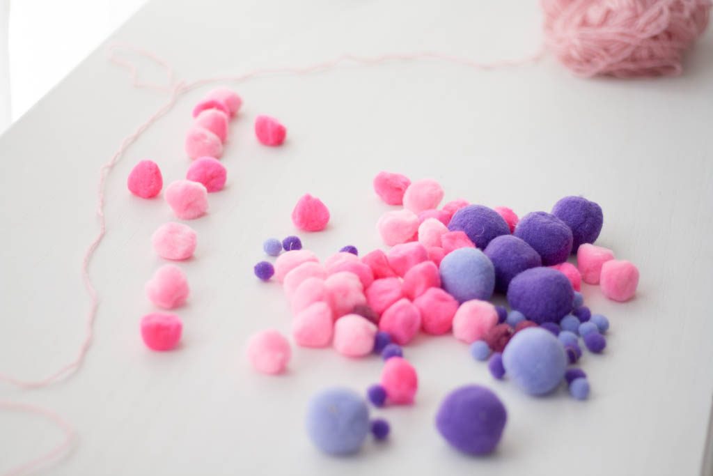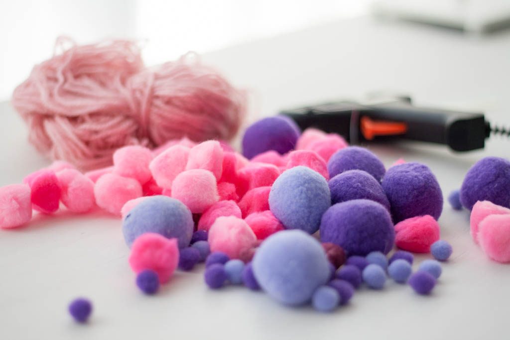 Tenía en casa unos cuantos pompones que habíamos usado para un juego hacia tiempo. Con ellos, un poco de lana y una pistola de cera he preparado una guirnalda de pompones muy sencillita pero resultona.