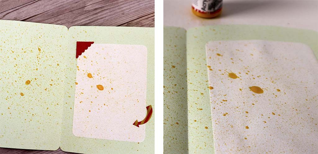 Añade decoracion también al interior de la tarjeta. Yo he usado pintura en spray para hacer las manchas y pegatinas de artemio para darle el toque final.